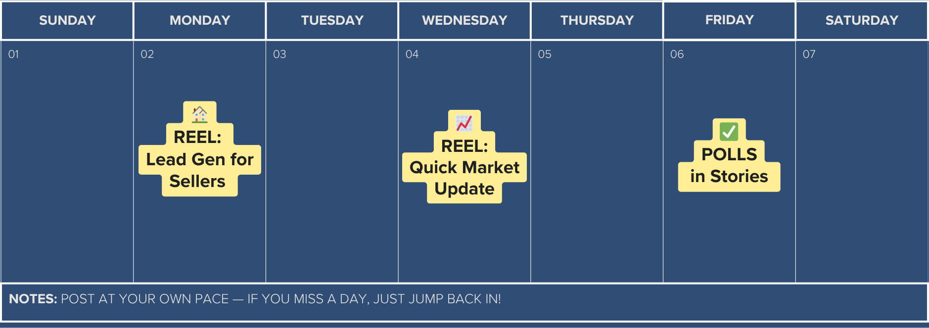 For small-town agents ready to post without stress and grow their reach beyond family and friends. Get a simple content calendar, plug-and-post templates you can customize, and Instagram Q&A support—everything you need to attract leads and show up like the go-to agent in your community.